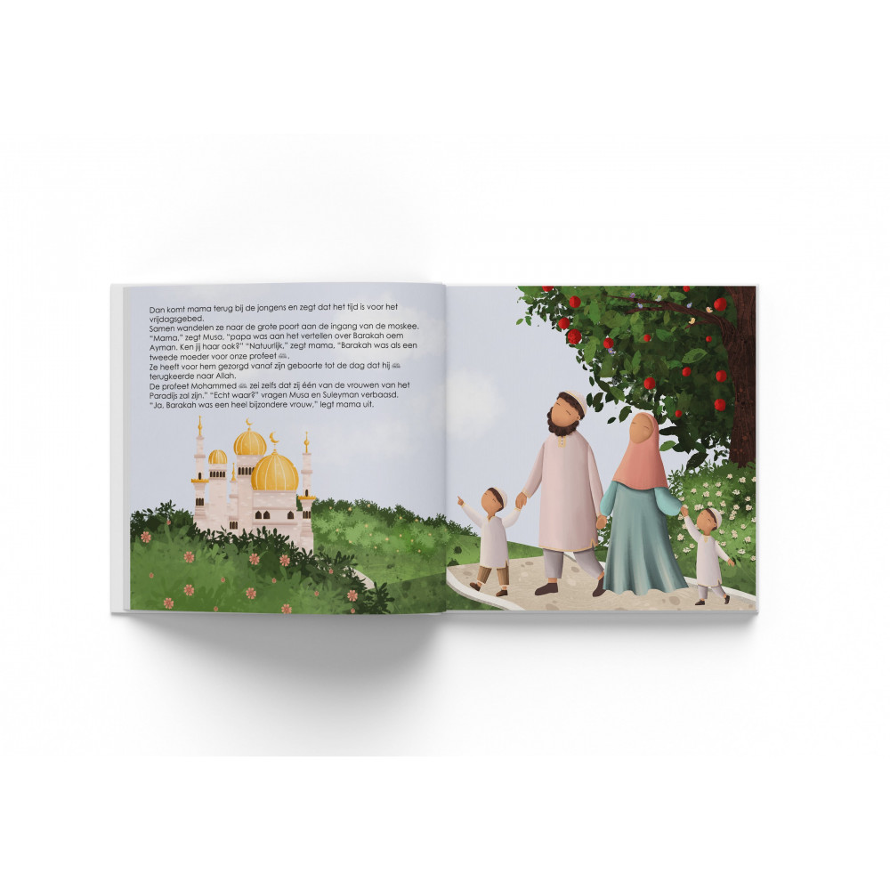 Musa en Suleyman zijn dolblij, want het is vrijdag. Onderweg naar de moskee komen ze de buurvrouw en haar baby’tje Barakah tegen. Dankzij deze onverwachte ontmoeting verandert het gesprek tijdens hun wandeling. Wanneer papa en mama vertellen over het verhaal van Barakah oem Ayman, zijn de jongens verbaasd. Barakah blijkt een echte heldin uit de tijd van onze profeet ﷺ te zijn. In dit verhaal kom je te weten welke belangrijke rol Barakah had in het leven van de profeet Mohammed ﷺ.